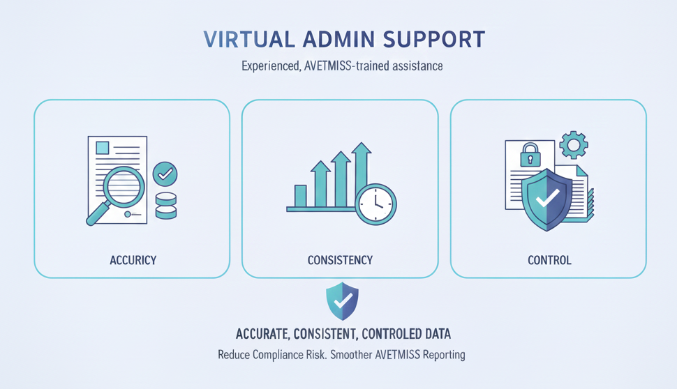 Virtual Admin support provides experienced, AVETMISS-trained assistance to keep your student data accurate, consistent, and under control throughout the year, reducing compliance risk and making AVETMISS reporting smoother and more predictable.